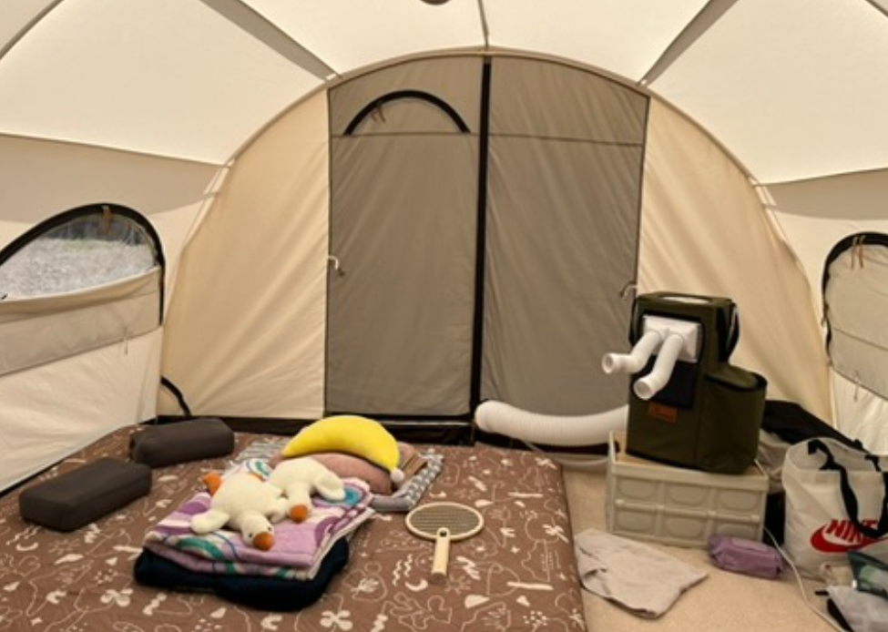 직사광선 밑 텐트 안에서는